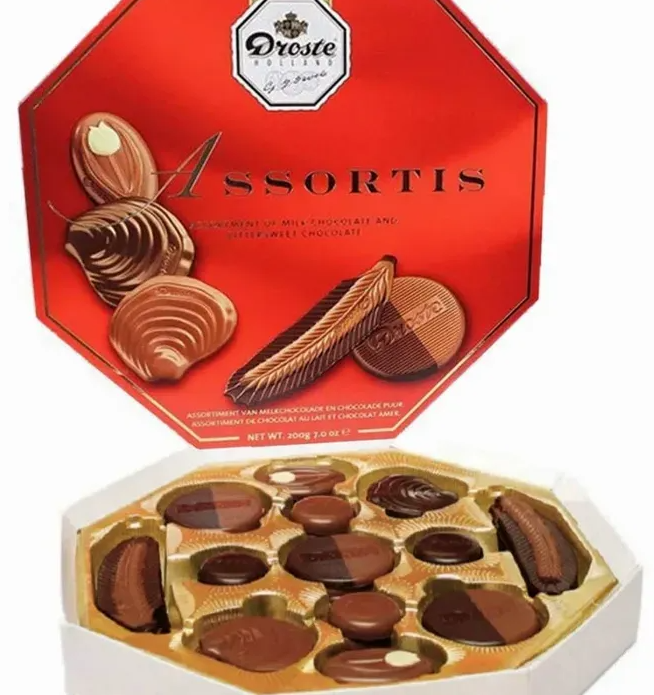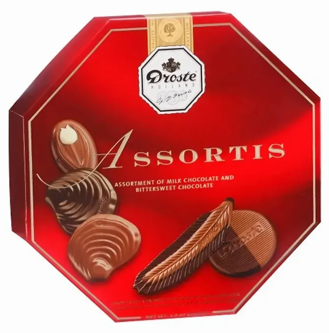 Delicious assortment of Droste Dutch chocolates presented in a gift box. The perfect gift for friends or family, this special giftbox contains a selection of milk and dark chocolates in different shapes.