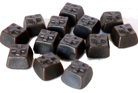 A square-shaped (“cross” shaped) Dutch licorice piece infused with menthol and eucalyptus flavour.