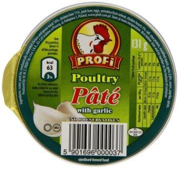 Ingredients: water, pork fat, mechanically separated chicken and goose meat, 14%, garlic 0.8%, chicken liver 11%, pork liver, eggs, wheat semolina, chicken hearts 3%, salt, soya protein, modified food starch, vegetable oil, vegetable (onion, paprica), spices.