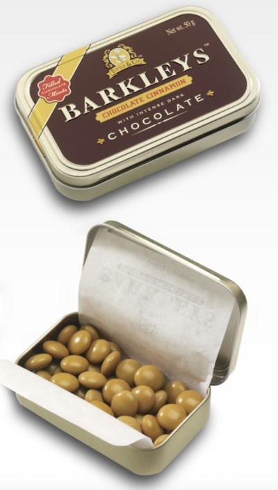 Barkley's chocolate cinnamon is a brown coated dragee with intense cinnamon flavour. Delicate and very special. Inside; it is filled with dark chocolate; resulting in a tasteful combination of intense peppermint and real dark chocolate. A delightful combination of Chocolate and Mint in a very attractive tin.